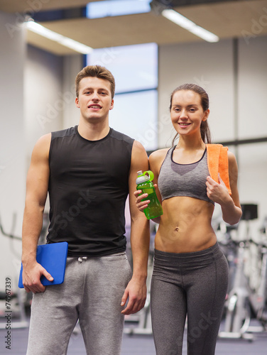 © Syda Productions, Obraz premium happy couple in gym with water and tablet pc