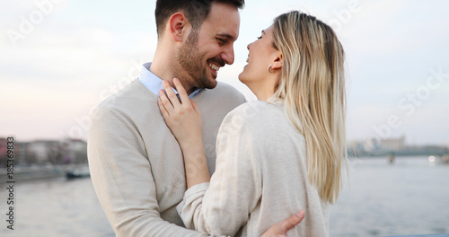 © NDABCREATIVITY, Obraz premium Happy couple in love hugging outdoor
