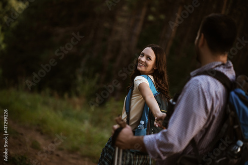 Fototapeta premium Happy couple is hiking in forest.