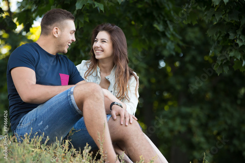 © fizkes, Fototapeta premium Happy couple sitting in park