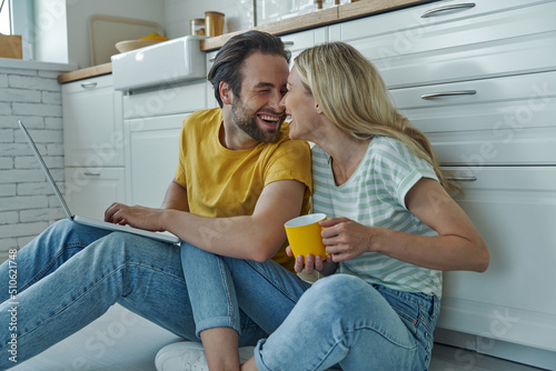 © gstockstudio, Obraz premium Happy couple using laptop while sitting on the floor and leaning at kitchen counter