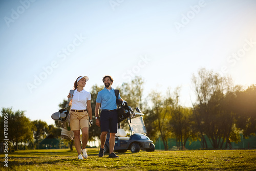 © Drazen, Obraz premium Happy couple with golf bags walking across course.