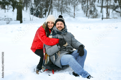 Obraz premium Happy couple with sledge outdoors on winter day