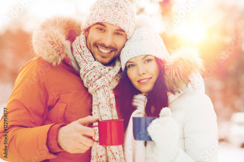 © Syda Productions, Obraz premium happy couple with tea cups over winter landscape