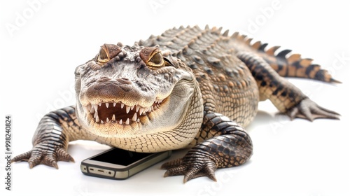© vlntn, Naklejka premium Happy Crocodile with Smartphone