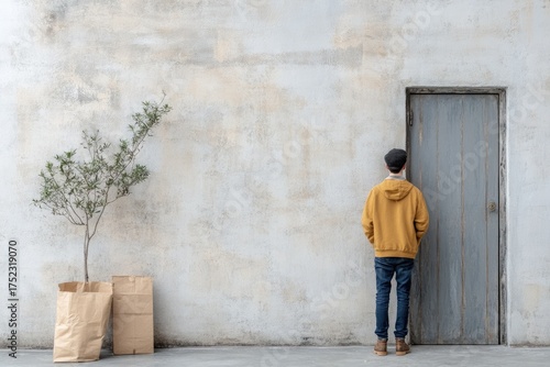 © Dennis, Fototapeta premium Happy customer receiving food delivery at home door