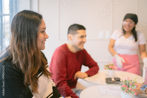 © Guillermo Spelucin, Fototapeta premium Happy customers ordering to a smiling waitress in a coffee shop