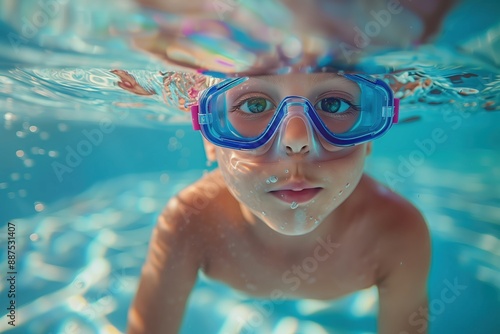 Fototapeta premium Happy cute boy swimming and dive underwater wearing swimming goggles, kids water sports activity