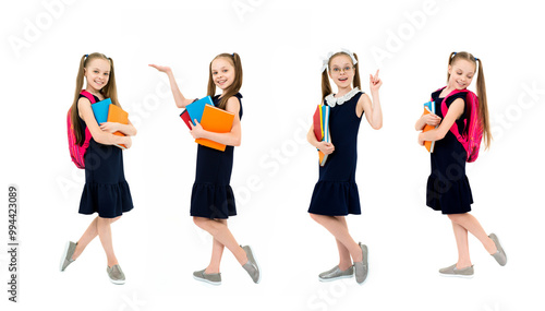 Fototapeta premium Happy cute child girl in school uniform holding books.