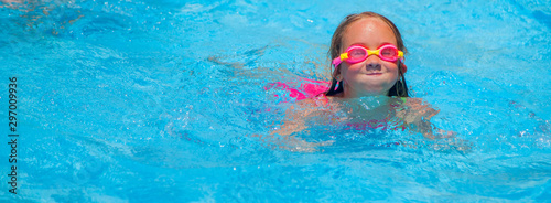 Naklejka premium Happy cute little girl learn to swimming and relaxing in the pool. Holidays...