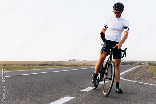 Obraz premium Happy cyclist in sport outfit standing outdoors