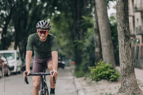 © Tymoshchuk, Obraz premium Happy cyclist training with bike on street of old city
