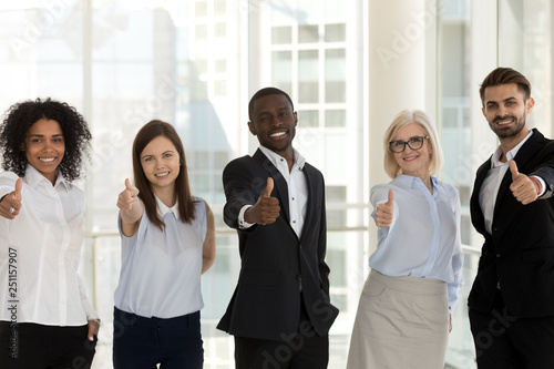 Obraz premium Happy diverse businesspeople standing looking at camera showing thumbs up