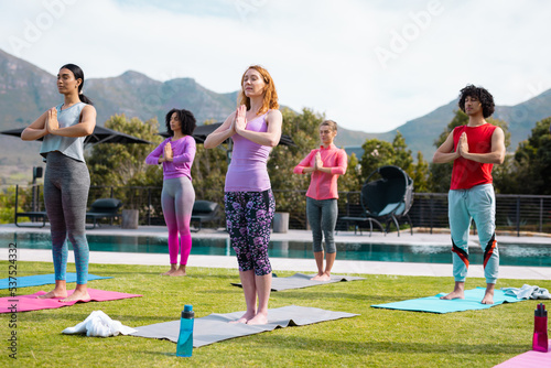 © wavebreak3, Obraz premium Happy diverse friends practicing yoga and meditating in garden