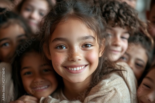 © ipika, Fototapeta premium Happy diverse kids, junior school children embracing female teacher appreciating and thanking educator in classroom