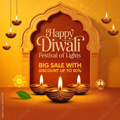 © MusammatFatema, Naklejka premium Happy diwali festival of lights big sale with discount up to 50 and diya lamps