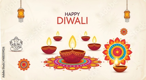 © kang, Naklejka premium Happy diwali greeting card with diya lamps isolated on white background
