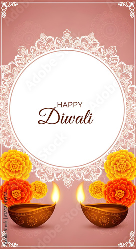 © Deepak, Naklejka premium Happy Diwali greeting card with marigold flowers and oil lamps