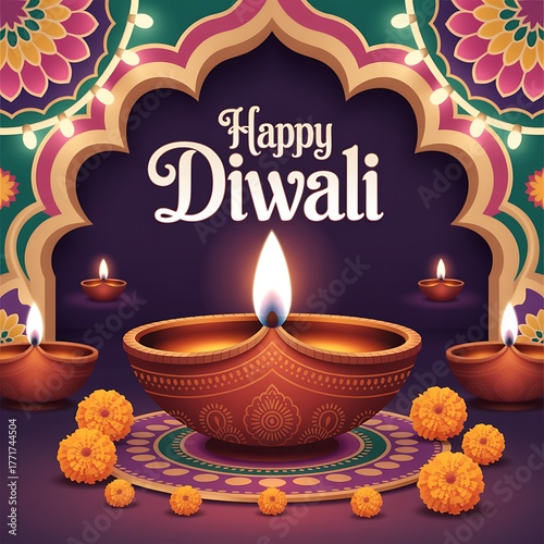 Naklejka premium Happy Diwali Greeting with Glowing Clay Diya Lamps, Marigold Flowers and Traditional Indian Arch