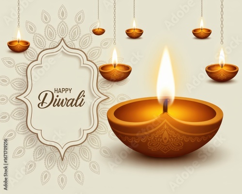 © Zabi, Naklejka premium Happy diwali greeting with illuminated diyas and decorative elements, celebrating the festival of lights with traditional lamps and intricate patterns