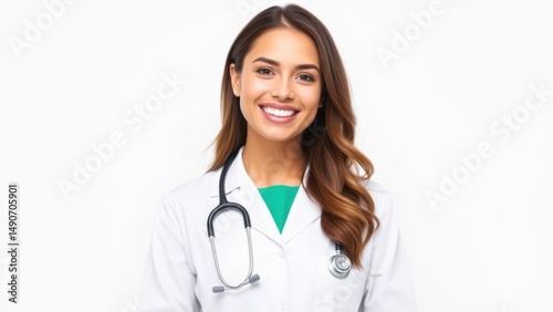 © Natalia, Fototapeta premium Happy doctor with stethoscope on white background