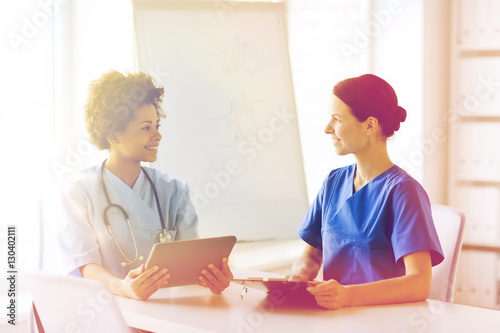 Fototapeta premium happy doctors with tablet pc meeting at hospital