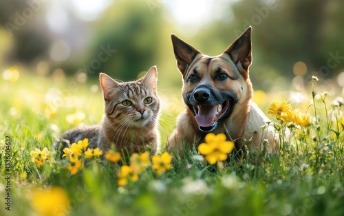 © Divine123victory, Obraz premium Happy Dog and Cat Relaxing in a Sunny Meadow