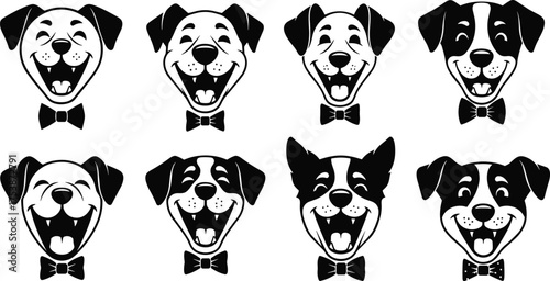 Naklejka premium Happy dog face illustration, cartoon style, black and white sketch, bow tie dogs, cheerful expression, pet character design, cute art