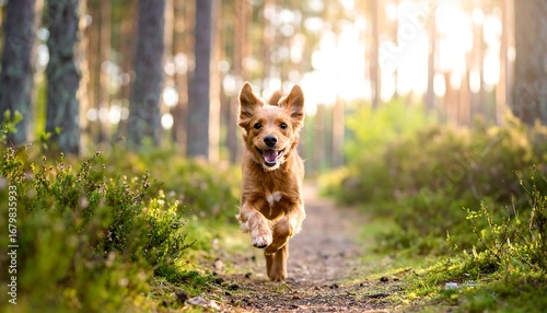 © Than, Naklejka premium Happy dog running on a forest path during golden hour.