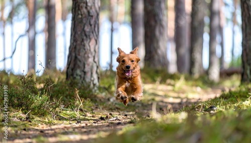 Naklejka premium Happy dog running through a sunlit forest path surrounded by trees and moss.