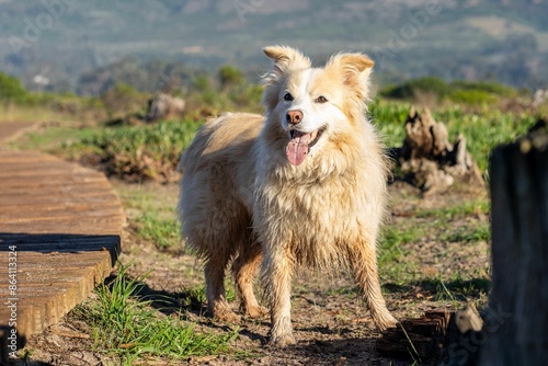 Fototapeta premium Happy dog with a fluffy coat standing on a nature trail with a scenic...