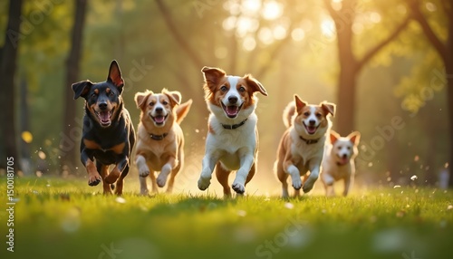 © miss irine, Fototapeta premium Happy dogs run joyfully through sunny park. Energetic pets enjoy play, fun, health. Companionship on green grass with happiness. Perfect leisure activity, love, freedom.