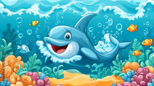 Obraz premium Happy Dolphin Swimming Underwater with Fish and Coral Reef