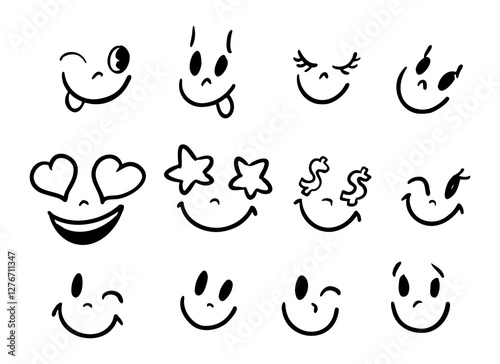Naklejka premium Happy doodle smiley collection isolated on white background. Simple faces. Cute icon set. Vector Illustration.