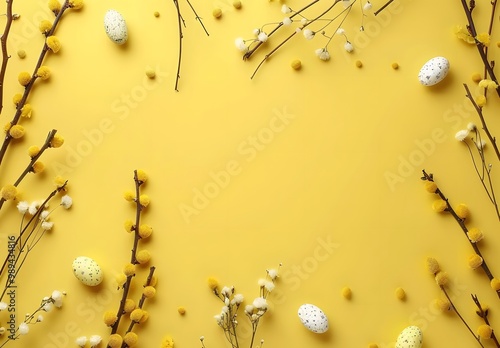© Eva, Fototapeta premium Happy Easter Background with Willow Branches, Eggs, and Flowers