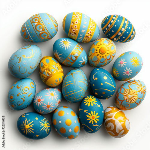 © pixele, Obraz premium Happy Easter! Banner with blue and yellow easter eggs in a basket. Banner, instagram post or greeting card.