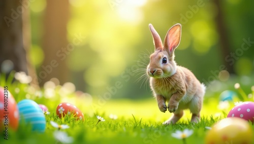 © Chanchai, Fototapeta premium Happy Easter bunny hopping through a spring meadow, surrounded by colorful eggs , cheerful, eggs