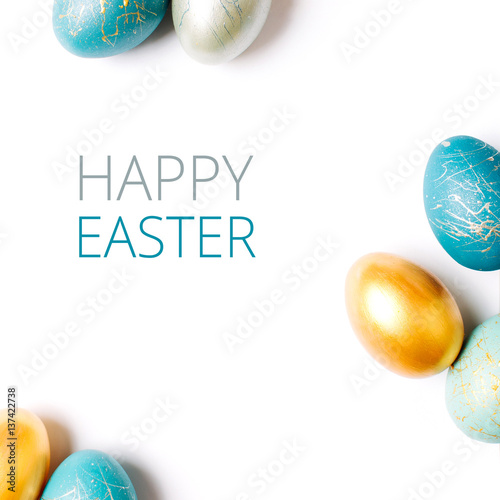 © igishevamaria, Fototapeta premium Happy Easter card. Frame with gold and blue easter eggs with copy space for text. isolated on white background