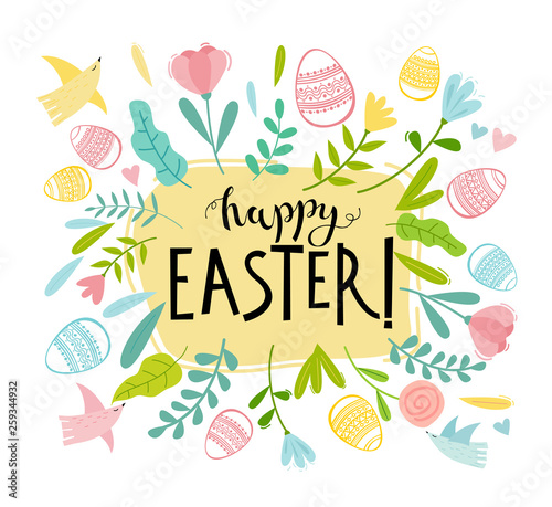 Naklejka premium Happy Easter card with decorative eggs and flowers frame. Hand drawn lettering