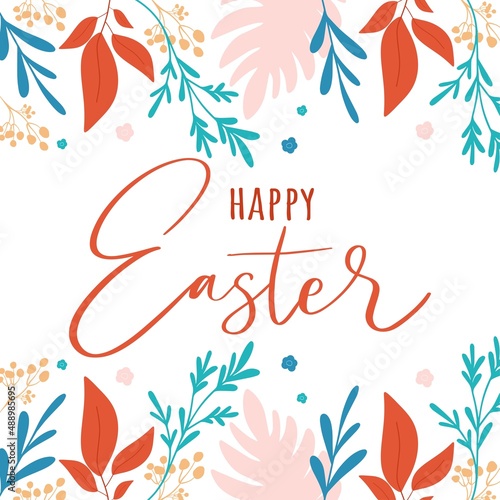 Fototapeta premium Happy easter card with lettering. Design banner with flowers. Vector card for greeting card, sale,offer,promotion