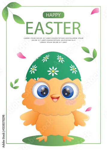 © Ksu Kovenkova, Obraz premium Happy Easter card with with a chicken and an Easter egg. Vector illustration for greeting card, banner, promo, sale, advertising.