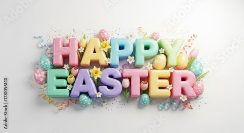 Obraz premium Happy Easter Colorful Pastel 3D Text Celebration with Decorative Elements