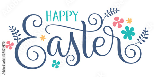 Fototapeta premium HAPPY EASTER colorful vector brush calligraphy banner with flowers