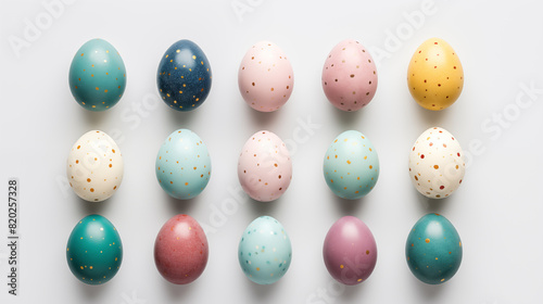 © Iuliia Pilipeichenko, Obraz premium Happy Easter concept. Preparation for the holiday. Easter candies, chocolate eggs, sweets on a colored background. Simple minimalism, flat lay, top view, copy space
