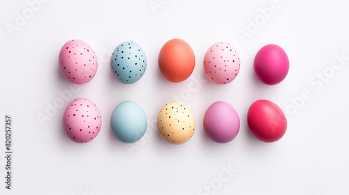 © Iuliia Pilipeichenko, Obraz premium Happy Easter concept. Preparation for the holiday. Easter candies, chocolate eggs, sweets on a colored background. Simple minimalism, flat lay, top view, copy space