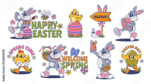Naklejka premium Happy Easter. Cute rabbits, chickens and eggs. Retro groovy Easter elements....