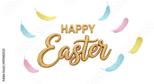 Obraz premium Happy Easter 3D Gold Text with Pastel Feathers isolated PNG with Transparent...