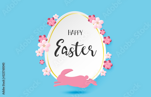 Naklejka premium Happy Easter day background with flower and pink rabbit in paper cut style....