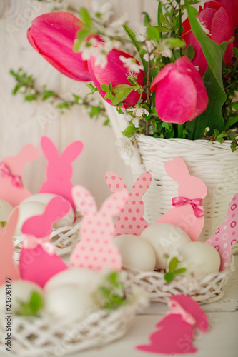 © COLOR PHOTO, Obraz premium Happy easter. Decor of Easter eggs in small white baskets.