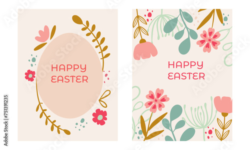 Naklejka premium Happy Easter, decorated geometric style Easter card set. Easter egg, flowers and text in modern minimalist style. Abstract flowers, and egg.